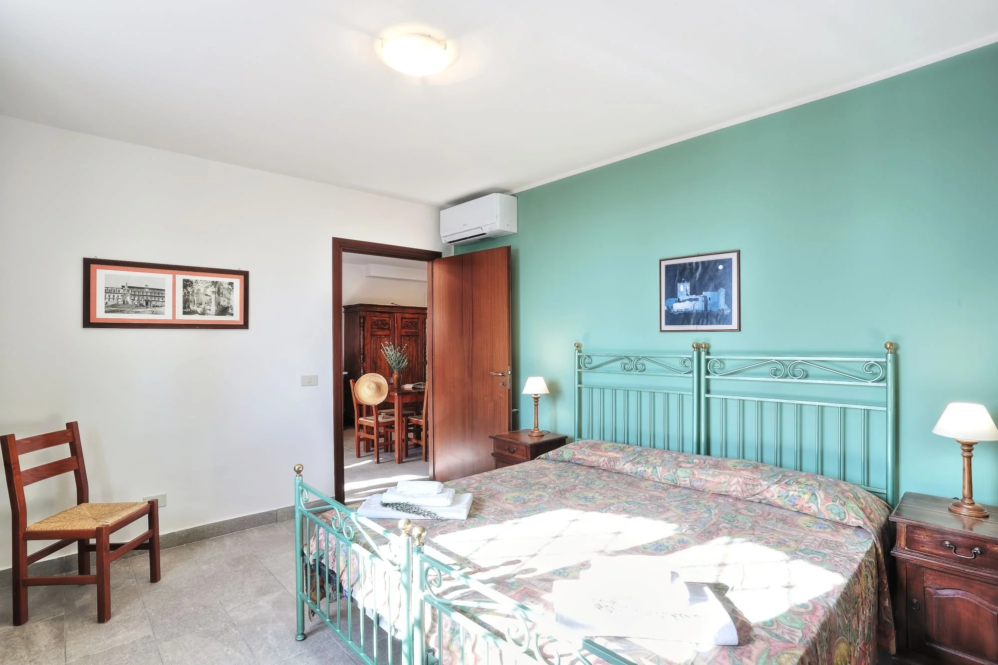 The Crociata apartment is near the reception in the courtyard. It has two bedrooms: one with a double bed, the other with twin beds. Both rooms have views of the Madonie Mountains. The bathroom is small but has everything you need. The living room is large with two sofas and the kitchenette is in a separate room.