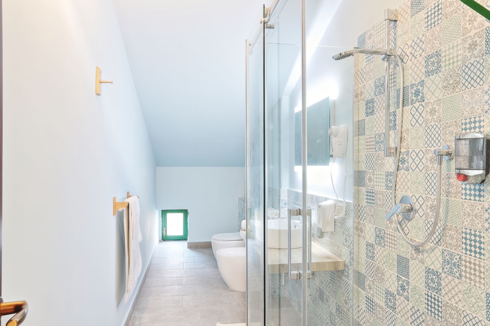 The Passo Matina junior suite, finished in period stone and plaster, is located on the second floor of the building, of which it is the final part. It has a spacious master bedroom with a rooftop opening and a living room with low double windows and another large window on the roof. A third guest can sleep in the sofa bed in this space. The bathroom is equipped with a shower.